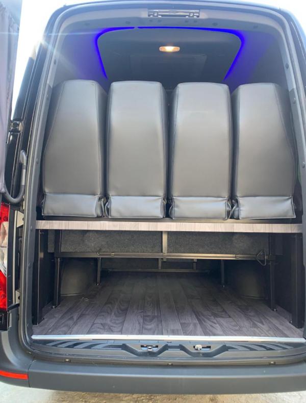 Mercedes Benz Sprinter 19 lugares - Van 24 horas aluguel de vans apresenta essa van superluxo executiva, na cor prata que acomoda confortavelmente de 18 passageiros com malas pequenas, modelo equipado com ar-condicionado direcional, vidros escurecidos e cortinas, assentos individuais e reclináveis em tecido soft plus, som ambiente com dvd e tvs de led em HD. Ótima altura interna e espaço para as pernas, ideal para viagens ou para traslados dentro da cidade.